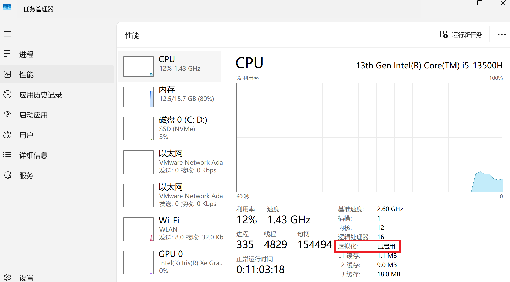 安装成功后,打开任务管理器(win+x)即可看到虚拟化已启用: