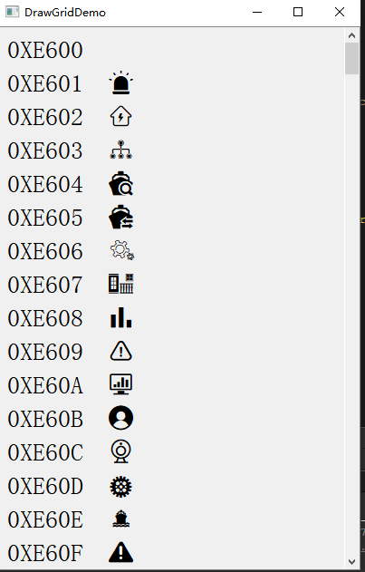{QApplication a(argc, argv);QFontDatabase fontDb;int id = fontDb.addApplicationFont(QCoreApplication::applicationDirPath() + "/iconfont.ttf");QString fontName = fontDb.applicationFontFamilies(id).at(0);QFont font(fontName, 20);QWidget *widget = new QWidget;QVBoxLayout *layout = new QVBoxLayout(widget);for (int i = 0xe600; i <= 0xe6ff; ++i) { // 常见图标区间QLabel *label = new QLabel(QString("0x%1 ").arg(i, 0, 16).toUpper() + QChar(i));label->setFont(font);layout->addWidget(label);}QScrollArea *scroll = new QScrollArea;scroll->setWidgetResizable(true);scroll->setWidget(widget);scroll->resize(400, 600);scroll->show();return a.exec();