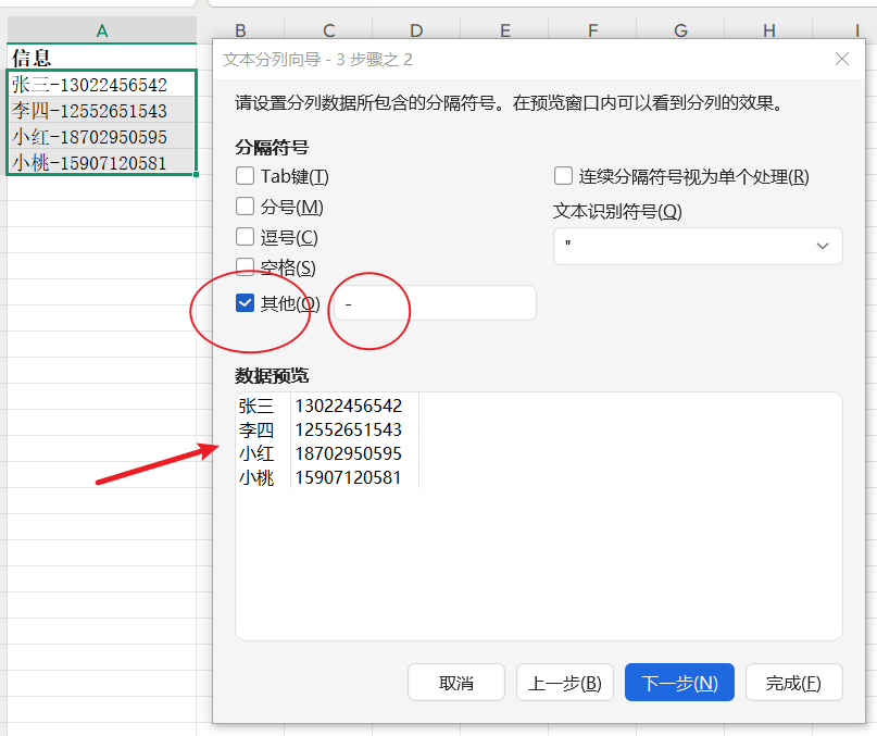 (5)在这一步,勾选 “其他”,并在后面的文本框中输入 “-” 作为分隔符,这时可以在预览窗口中看到数据已经被正确地分隔开了,点击 “下一步”;