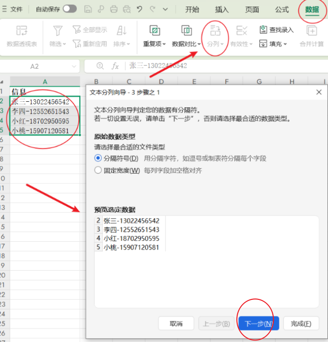 (4)在向导的第一个步骤中,选择 “分隔符号”,因为我们的数据是用 “-” 分隔的,然后点击 “下一步”;