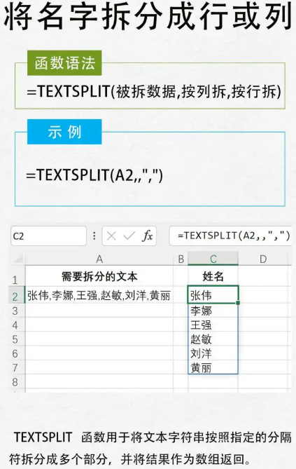 例如,单元格 A2 中的内容是 “张伟,李娜,王强,赵敏,刘洋,黄丽” ,要将这三种水果拆分到相邻单元格,在 C2 单元格输入公式 “=TEXTSPLIT (A2,",")” ,然后按下 Enter 键,就会自动将文本按逗号分隔,将 “张伟”“李娜”“王强” 分别显示在不同单元格中 。如果数据中存在空值,还可以设置第 4 个参数为 TRUE 来忽略空值,如 “=TEXTSPLIT (A2,",",,TRUE)” 。