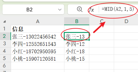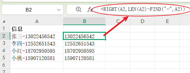 RIGHT 函数:从文本字符串的末尾提取指定数量的字符。还是以上面的数据为例,若要提取电话号码,在 C1 单元格输入公式 “=RIGHT (A2,LEN (A2)-FIND ("-",A2))” ,LEN (A2) 是获取整个文本的长度,减去 “-” 的位置,就是电话号码的字符长度,RIGHT 函数就会从文本末尾提取电话号码。