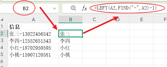 LEFT 函数:用于从文本字符串的开头提取指定数量的字符。例如,单元格 A2 中的内容是 “张三 - 13812345678”,如果要提取姓名 “张三”,可以在 B1 单元格输入公式 “=LEFT (A1,FIND ("-",A2)-1)” 。这里 FIND ("-",A2) 是查找 “-” 在文本中的位置,然后减 1 就是姓名的字符长度,LEFT 函数就会从文本开头提取相应长度的字符。
