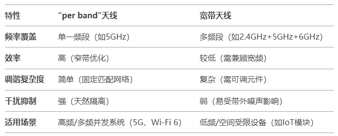 “per band” 天线 是指 为特定频段(Band)专门设计的天线,而不是使用单一宽带天线覆盖多个频段。这种设计方式在无线通信(如5G、Wi-Fi、卫星通信等)中广泛应用,以提高信号效率、简化调谐并减少干扰。