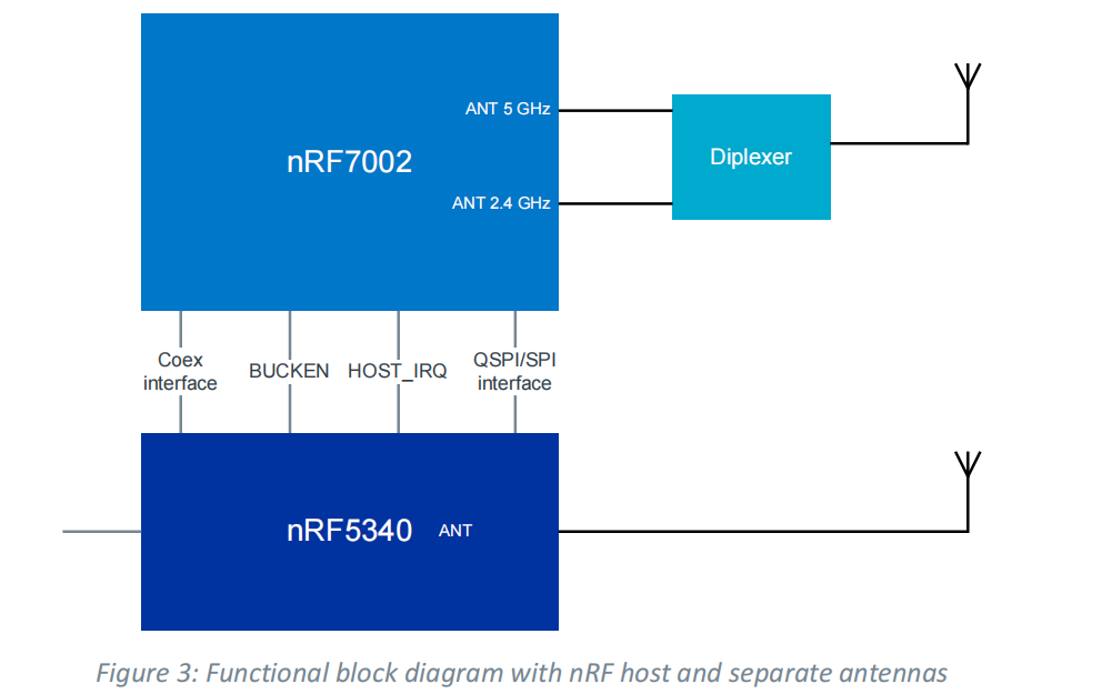 下图展示了nRF7002与nRF5340一起实现Ble和Wi-Fi结合的解决方案,nRF5340作为无线系统的主机和公共接口,使用单独的天线配置可以同时实现2.4 GHz/Wi-Fi和蓝牙/IEEE 802.15.4操作