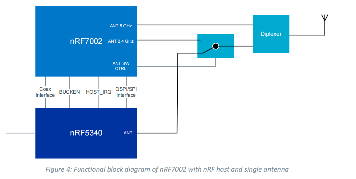 单天线配置也是可以的,但需要一个天线开关(antenna switch),可以通过无线电共存算法进行控制,下图为nRF7002的单天线配置(与使用双天线相比,在信号路径中引入开关可能会造成灵敏度损失(通常<1dBm))