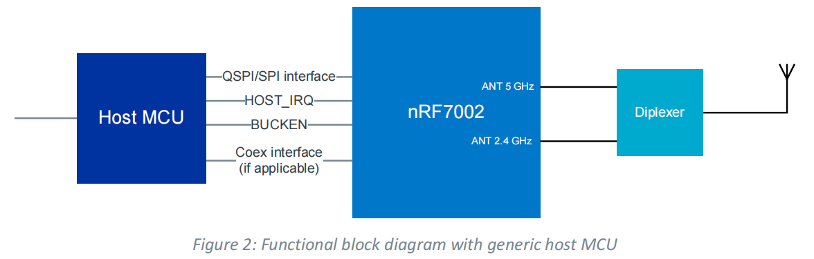 2:Nordic nRF7002是需要连接到主MCU或Linux处理器的无线wifi6配套设备,它通过QSPI(6线)或SPI(4线)连接到主机,用于数据和包含蓝牙LE/IEEE 802.15.4 radio的主机的3线或4线共存控制接口。另外,HOST_IRQ和BUCKEN是必需的,用户应用程序在主机MCU上执行,下图显示了使用nRF7002和通用主机MCU的系统