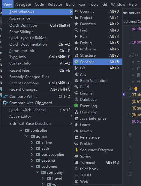 IntelliJ IDEA 提供了 “Services” 工具窗口,专门用于管理 Spring Boot 应用,自动显示端口号、运行状态、健康检查等,并且可以固定在底部或侧边。