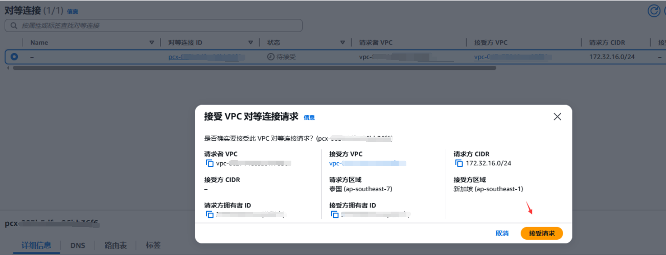 例子:在泰国和新加坡区域创建对等连接,让两个网络走内网。
