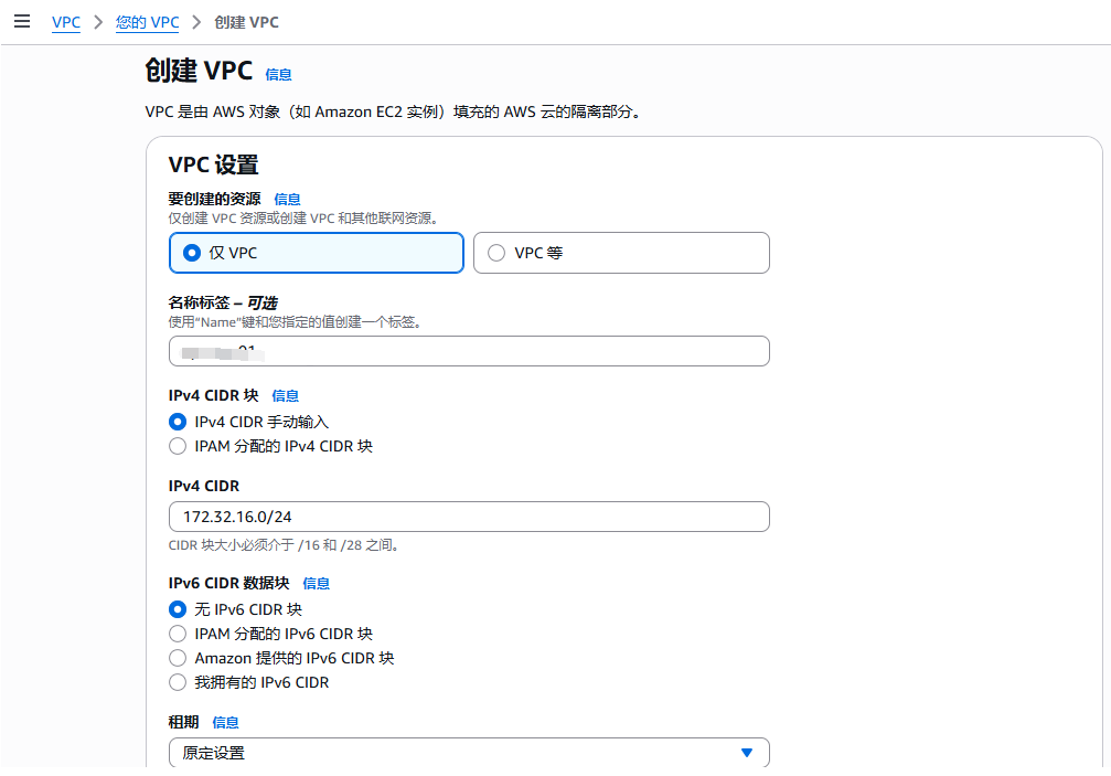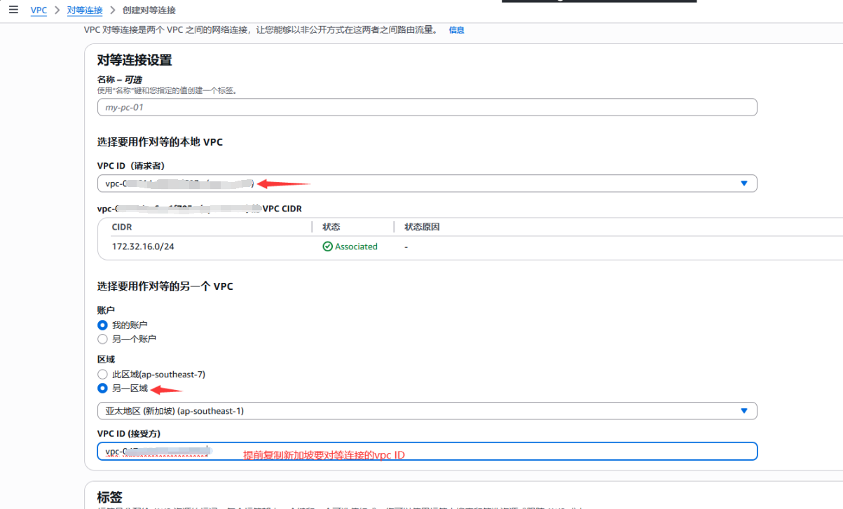 泰国地区需要重新创建vpc,新加坡可以用默认的,只要两个在不同的网段即可。