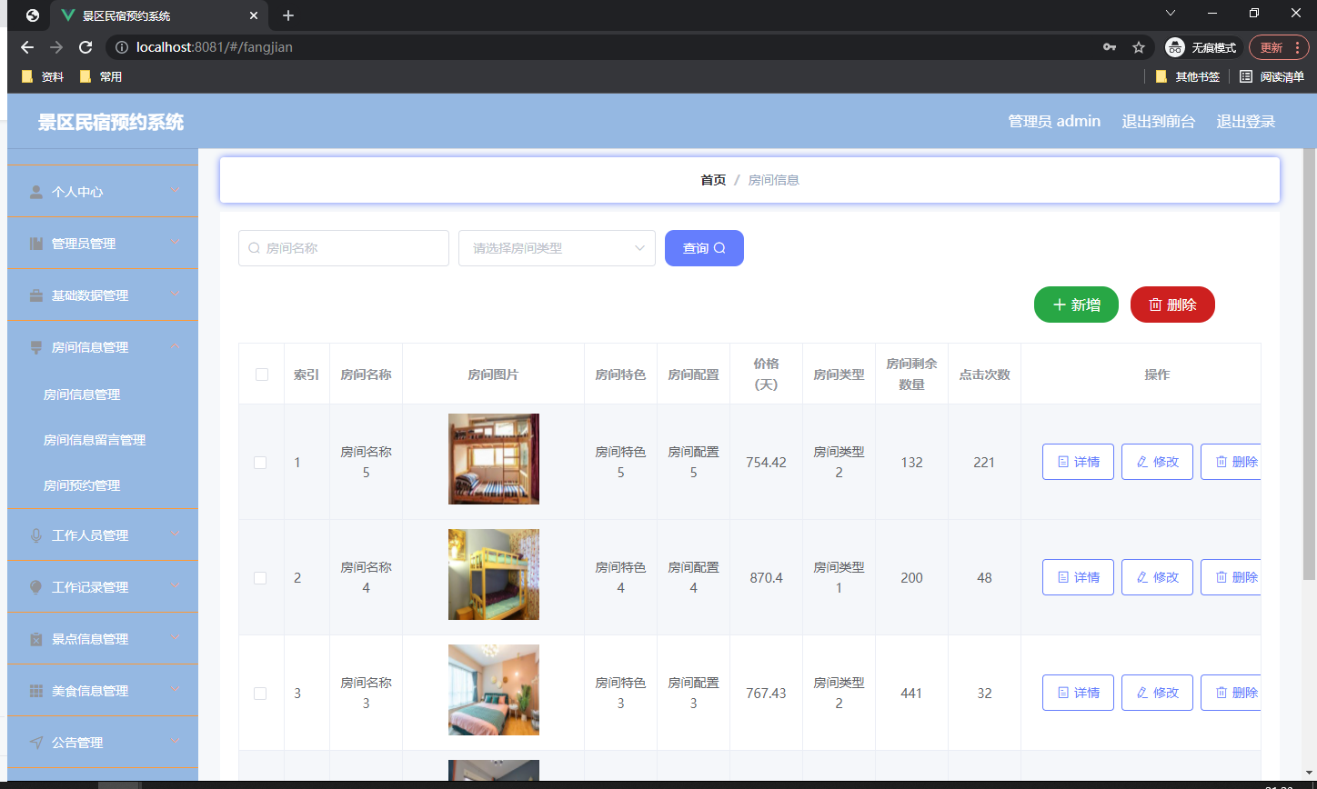 如图5.2显示的就是房间信息管理页面,此页面提供给管理员的功能有:查看已发布的房间信息数据,修改房间信息,房间信息作废,即可删除,还进行了对房间信息名称的模糊查询