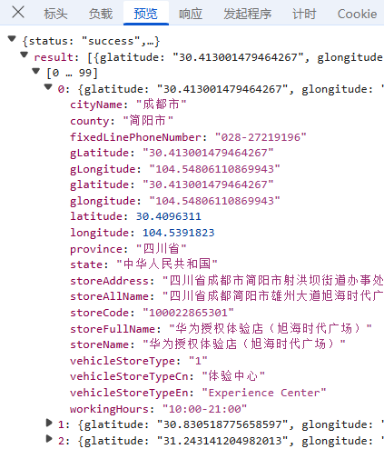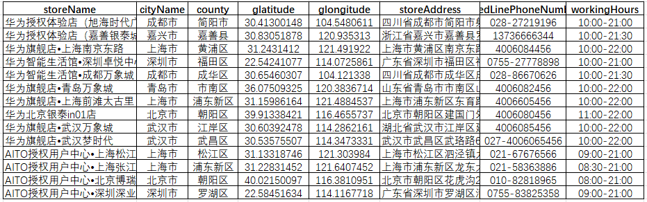 获取数据标签如下:storeName(门店名称)、cityName(地级行政区)、county(县级行政区)、storeAddress(地址)、fixedLinePhoneNumber(电话)、workingHours(营业时间)、lng & lat(地理坐标),其他一些非关键标签,这里省略;