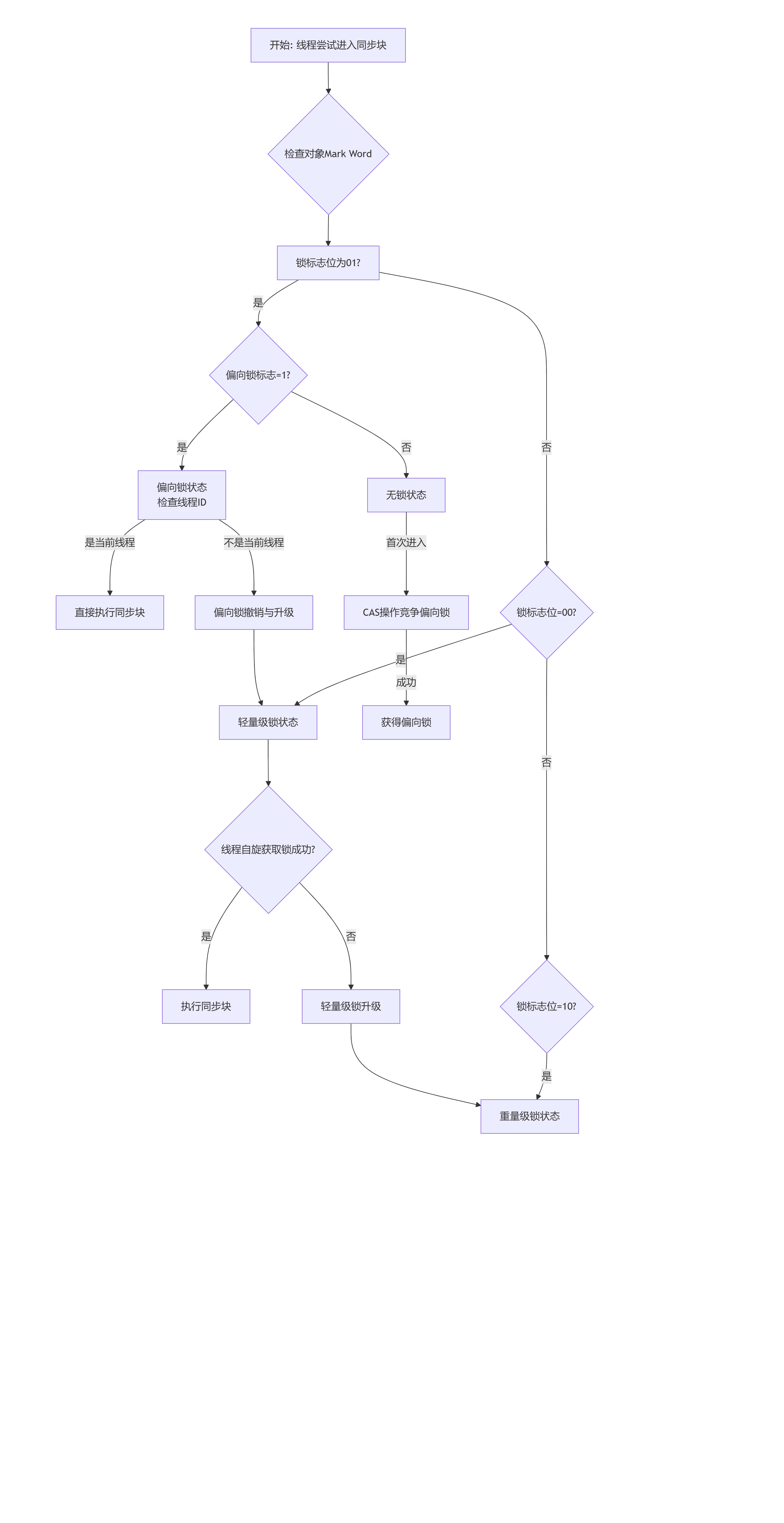 如果 CAS 成功,线程 A 就获得了偏向锁。对象头的偏向锁标志位变为 ‘1’,锁标志位仍为 ‘01’。之后,只要没有其他线程来竞争,线程 A 每次进入这个同步块时,只需要检查 Mark Word 中的线程ID是否是自己,如果是,则直接进入,无需任何同步操作。