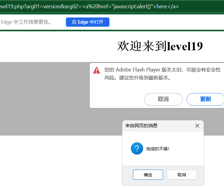 没有用呢,看看大佬的wp吧XSS-labs Level 19 Flash XSS_xsslabs 19-CSDN博客,这里没有东西出现是因为缺少flash,我使用的是edge,启用IE模式即可显示出内容