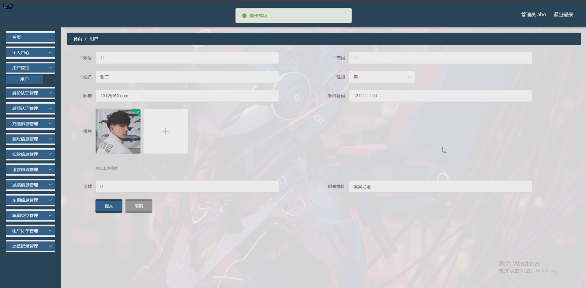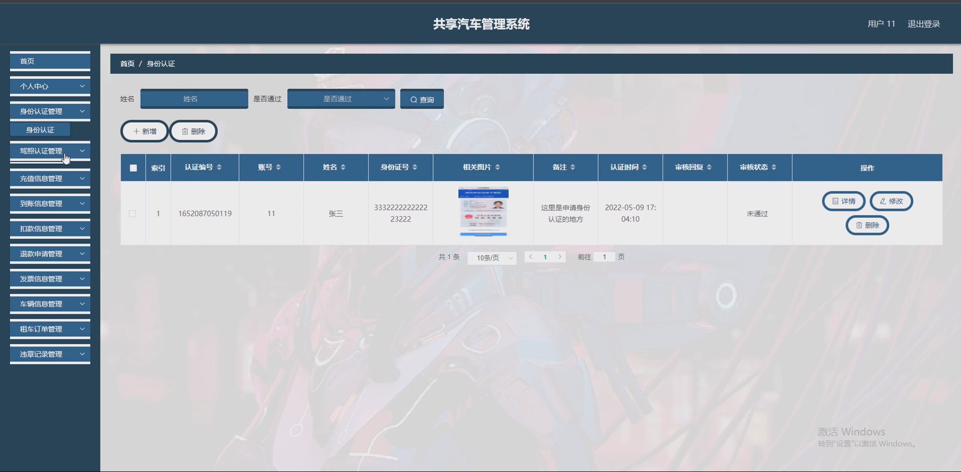 - 用户与认证模块:实现用户注册(手机号 / 邮箱验证)、登录(密码加密存储,采用 MD5 算法);身份认证与驾照认证功能,用户上传身份证、驾照照片后,管理员在后台审核,审核结果实时同步至用户端。