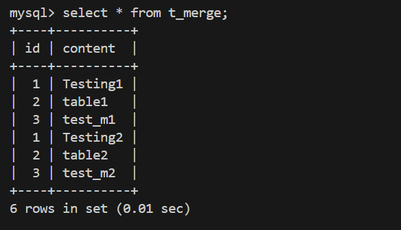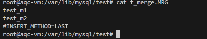 mysql> CREATE TABLE t_merge (id INT NOT NULL AUTO_INCREMENT,content CHAR(20), INDEX(id))ENGINE=MERGE UNION=(test_m1,test_m2) INSERT_METHOD=LAST;