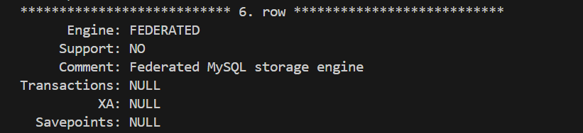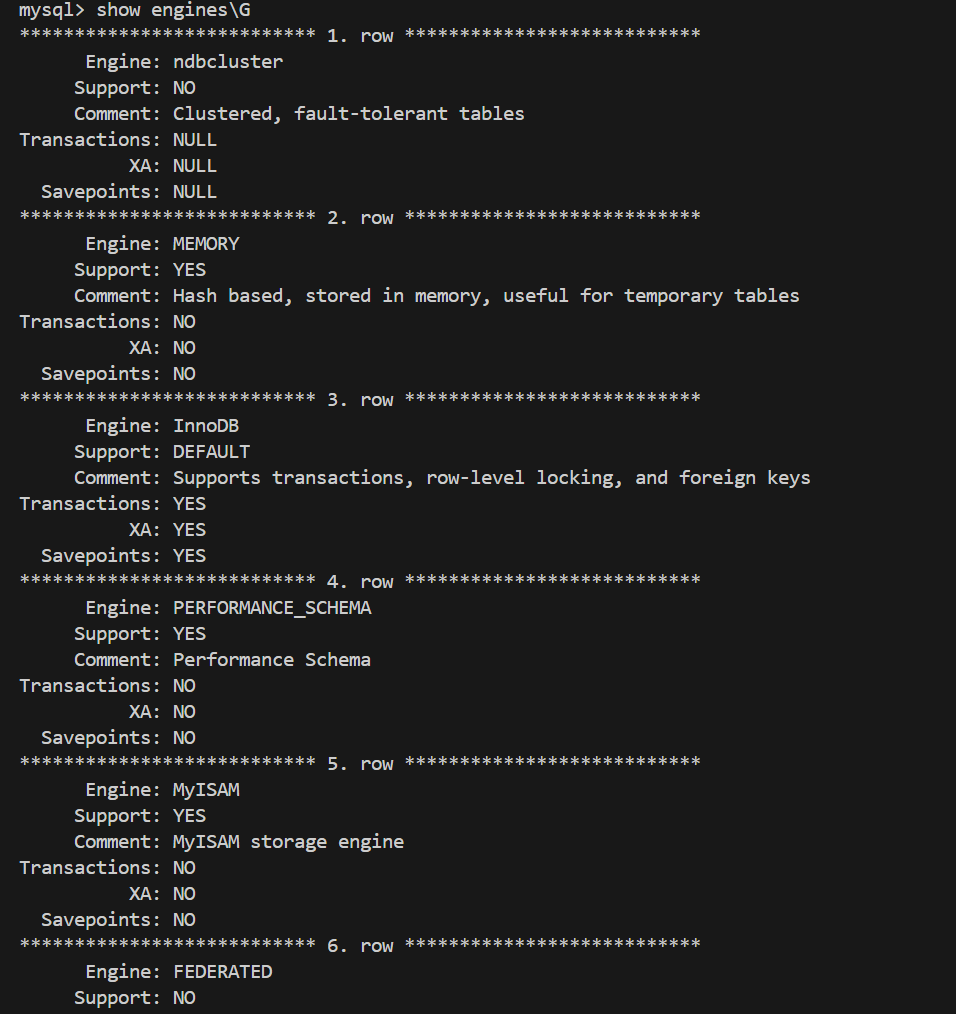 查看当前服务器⽀持哪些存储引擎可以使⽤ SHOW ENGINES 语句, Engine 表⽰:存储引擎的