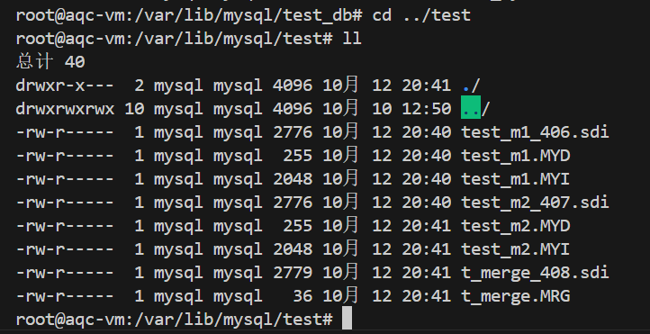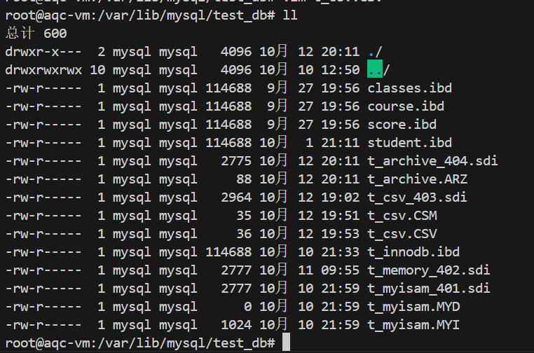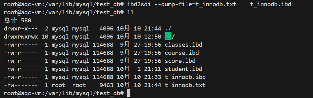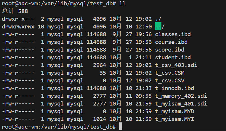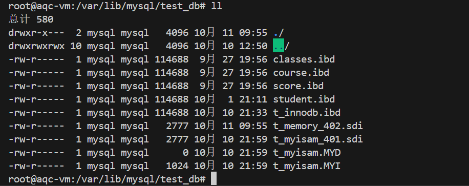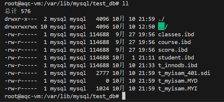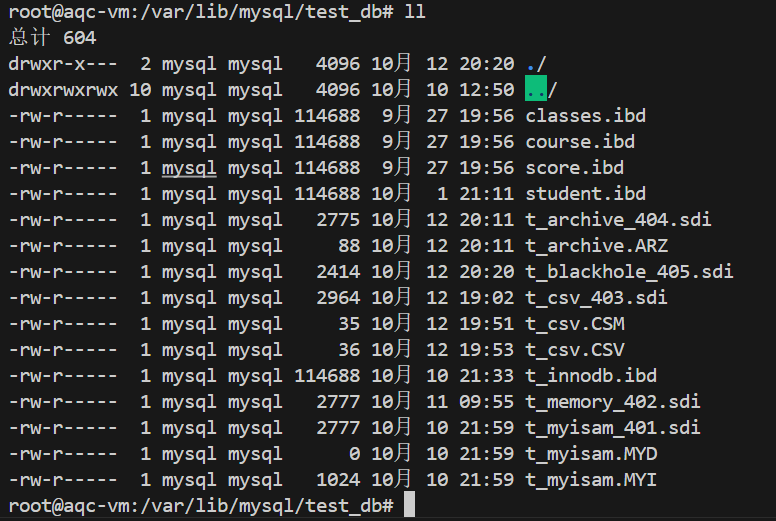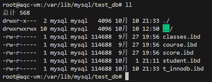 当创建⼀个存储引擎为 InnoDB 的表时,会在 data_dir/test_db ⽬录下⽣成⼀个⽤来存储结构、数据、索引的物理⽂件,命名格式为 表名.ibd ,以当前为例会在 /var/lib/mysql/test_db ⽬录下⽣
