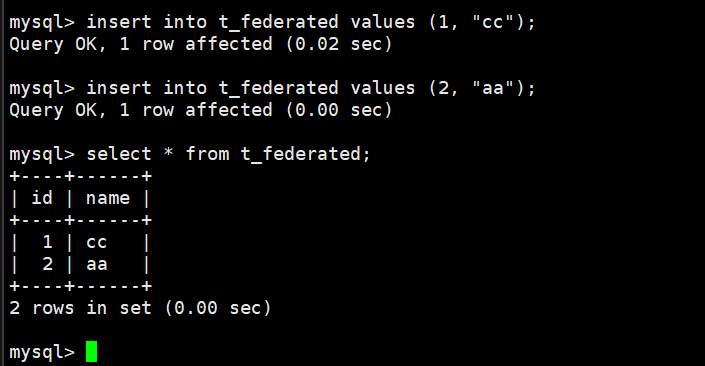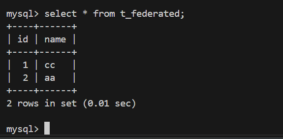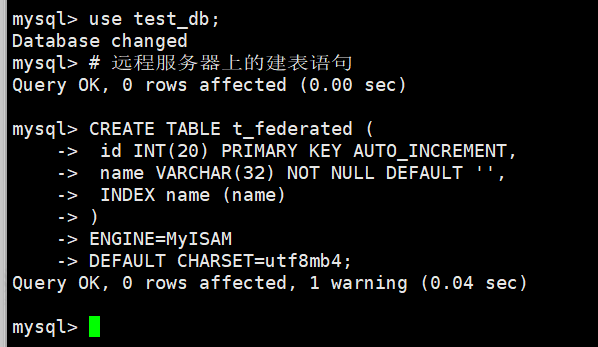 CREATE TABLE t_federated (id INT(20) PRIMARY KEY AUTO_INCREMENT,name VARCHAR(32) NOT NULL DEFAULT '',INDEX name (name))