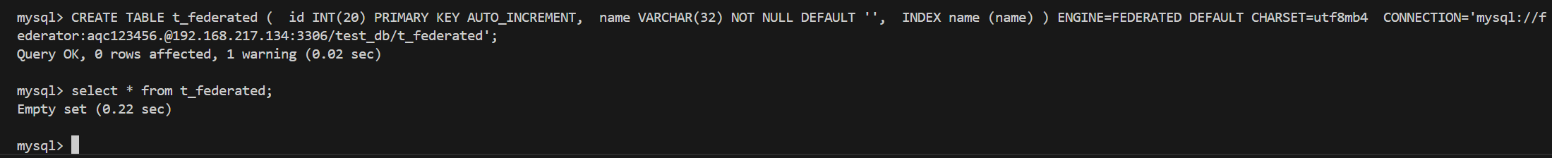 CONNECTION='mysql://federated:Fed123!!!@192.168.100.242:3306/test_db/t_federate