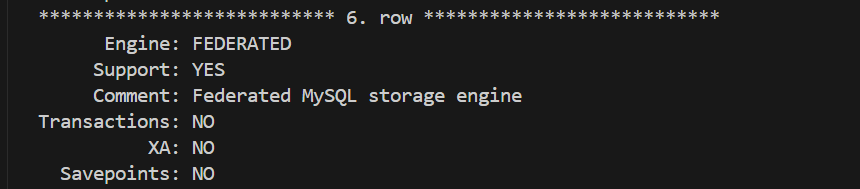 3、federated表不会有数据⽂件,表定义在数据字典中,⽣成 .sdi 为后缀的表信息描述⽂件(JSON格式)