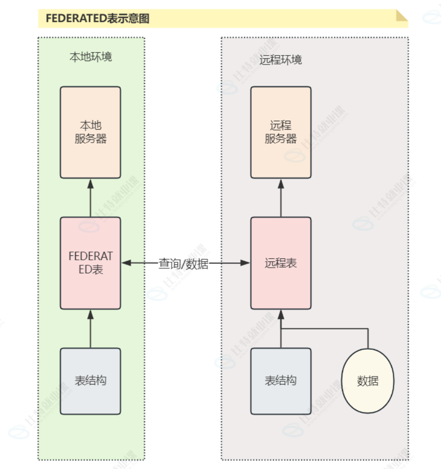 2、在不使⽤复制或集群技术的情况下, FEDERATED 存储引擎可以实现对远程MySQL数据库中数据的访问,以远端物理服务器为基础创建⼀个逻辑数据库,当查询 FEDERATED 表时,将会从远程数据库获取数据,⾮常适合分布式或数据集市环境。