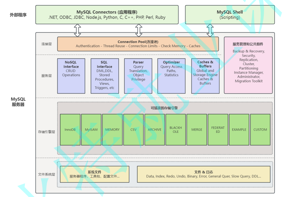器、缓存、存储引擎、⽂件系统组成。MySQL还为各种编程语⾔提供了⼀套⽤于外部程序访问服务器的连接器,也就是API。整体架构图如下所⽰:
