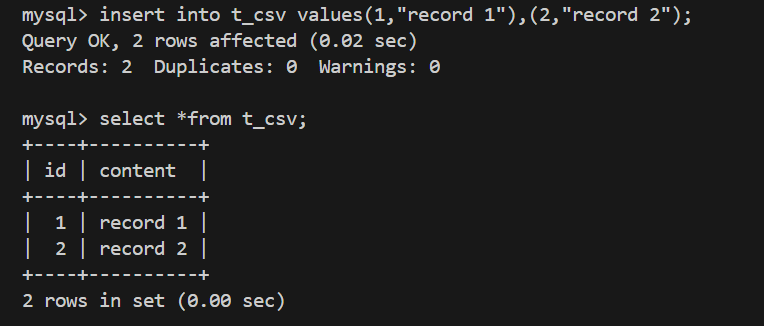 mysql> INSERT INTO test_m2 (content) VALUES ('Testing2'),('table2'),