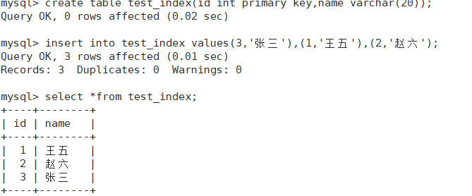 我们可以观察到,在我们设置了主键之后,就算我们插入数据的顺序并没有按照顺序来,但是当我们进行查找是可以发现他们是有序的,这是为什么?