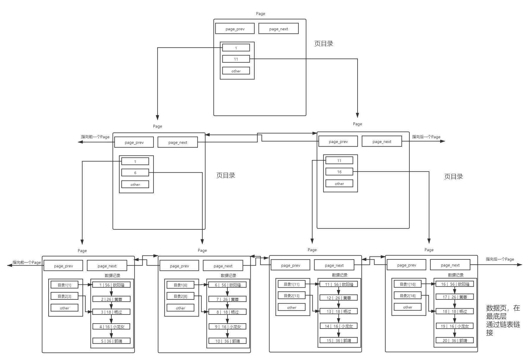 不同的 page,在mysql中都是16KB,采用两个指针构成双向链表