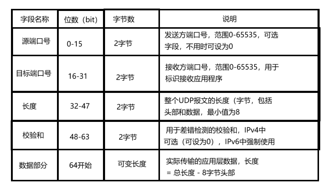 UDP 是一种轻量、快速但不可靠的传输协议。它的报文结构简单,头部固定为 8 字节,适用于对实时性要求高、可容忍部分数据丢失的场景。在使用 UDP 时,开发者通常需要在应用层实现可靠性机制(如重传、排序)来满足业务需求。