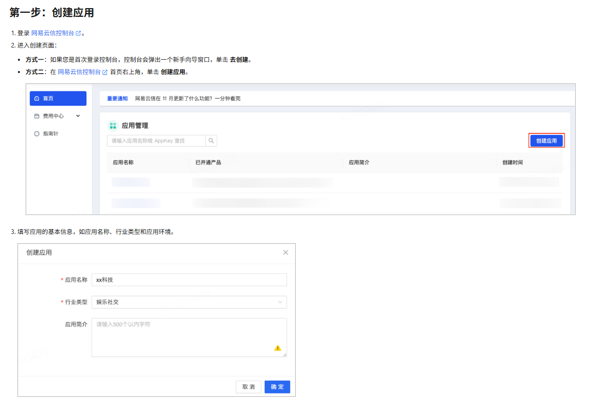 创建应用是在云信开发者平台创建应用,所以要先注册账号,就是填写信息,是个人还是企业,注册好账号之后,就是在控制台创建我们的应用:
