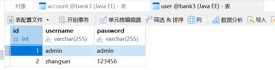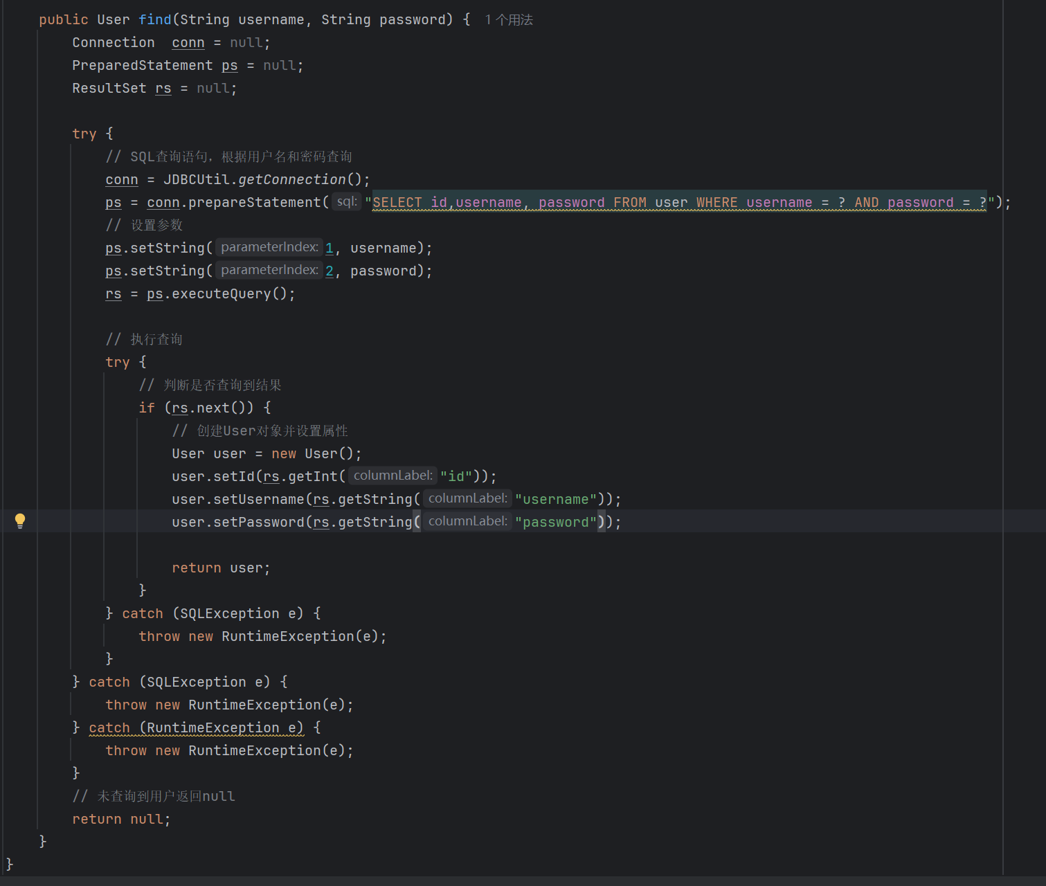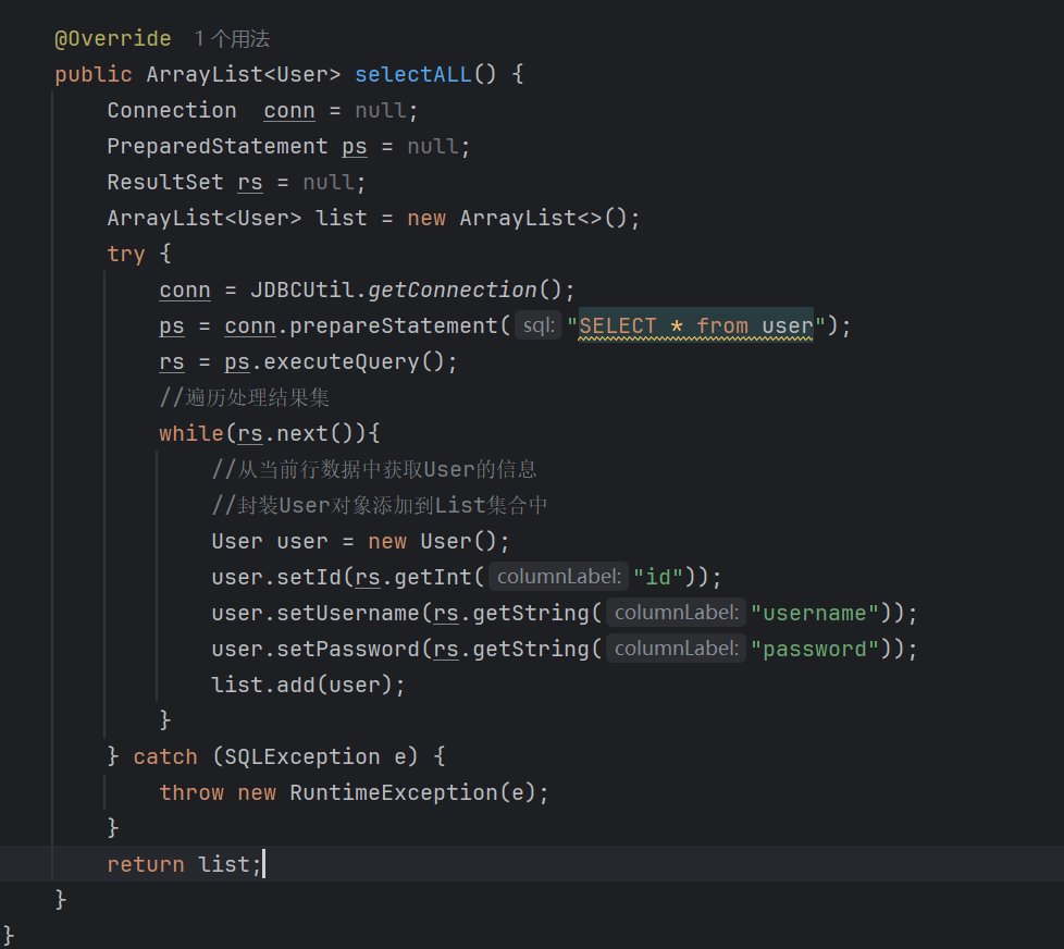 public class testJDBCUtil {public static void main(String[] args) {//声明对象Connection conn = null;PreparedStatement ps = null;ResultSet rs = null;try{//1.获取数据库连接conn = JDBCUtil.getConnection();//2.传输sql语句ps = conn.prepareStatement("SELECT * from User WHERE ID = ?");ps.setInt(1,1);//因为id是int类型,所以调用setInt方法//3.执行sql语句rs = ps.executeQuery();//4.处理结果集while(rs.next()){//获取当前便利的数据int id = rs.getInt("id");String name = rs.getString("username");String password = rs.getString("password");System.out.println(id+","+name+","+password);}} catch (SQLException e) {throw new RuntimeException(e);}finally {//5.释放资源JDBCUtil.close(rs,ps,conn);}}