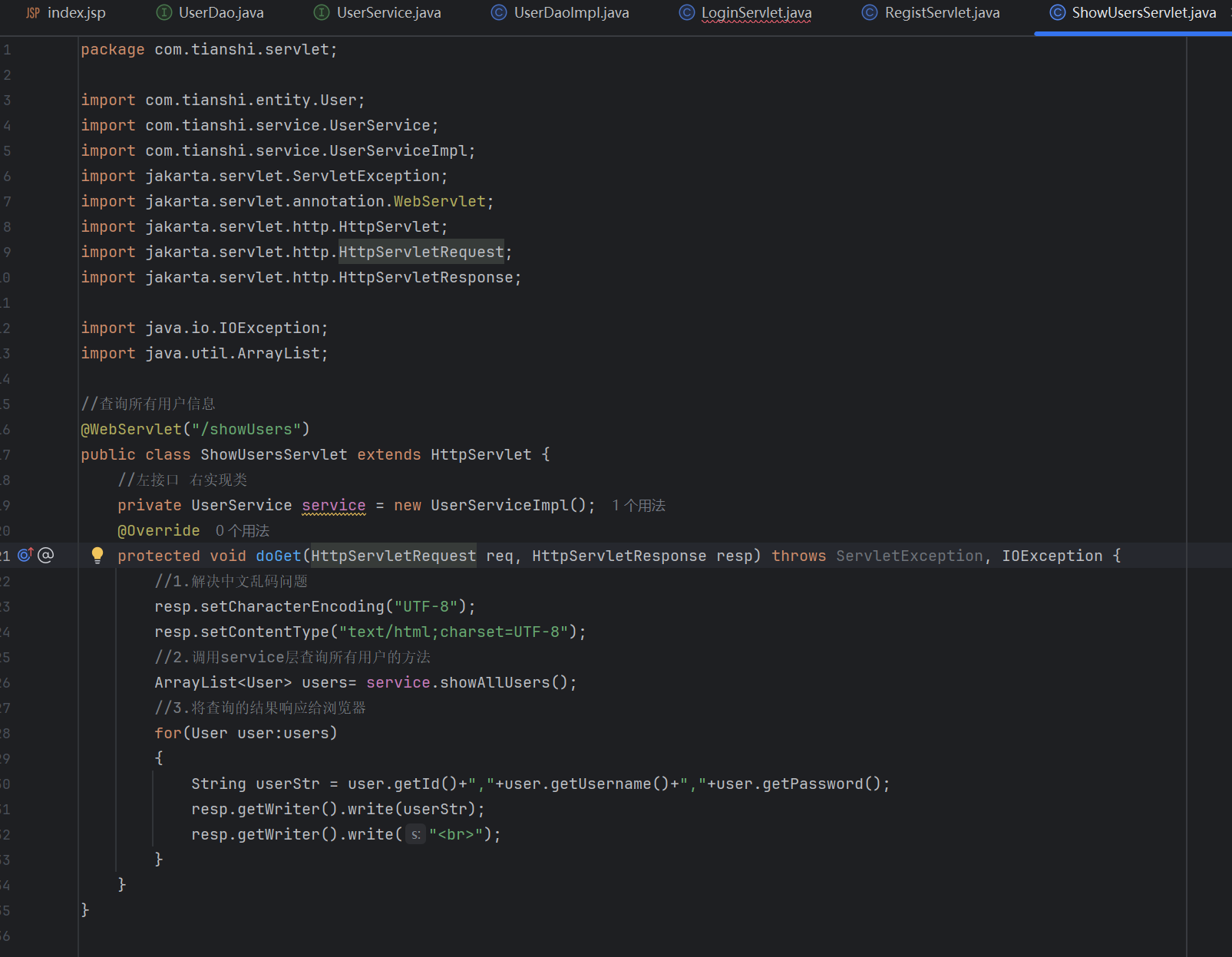 在com.tianshi.service包下创建ShowUsersServlet类,实现查询所有用户信息功能,要求将所有用户信息显示到浏览器网页中。