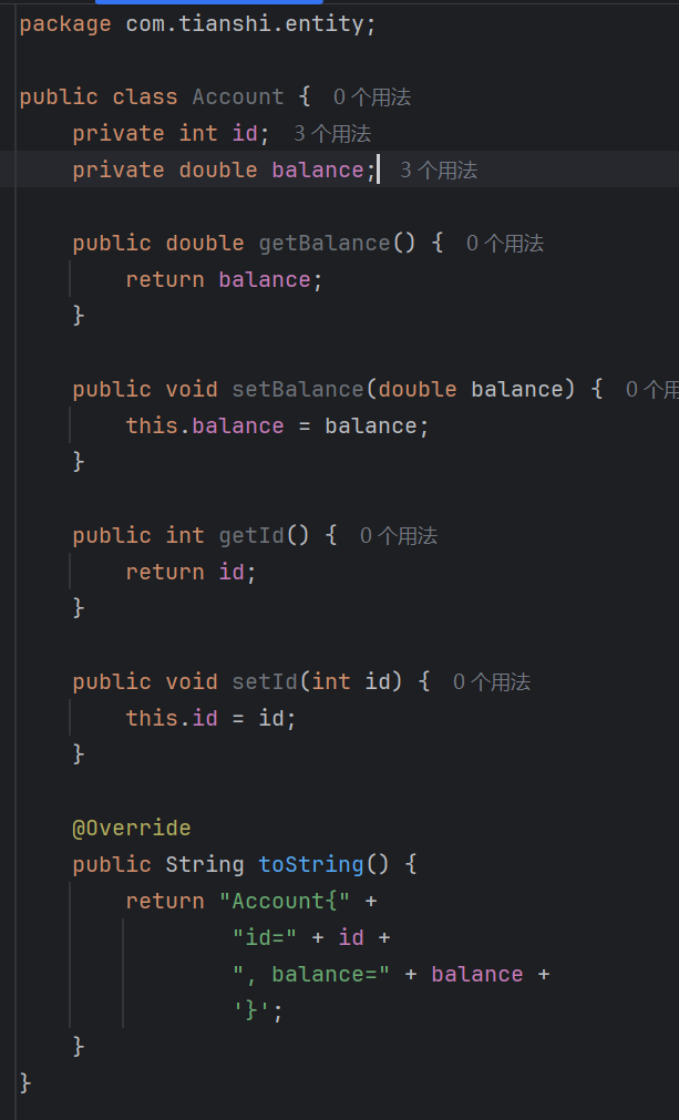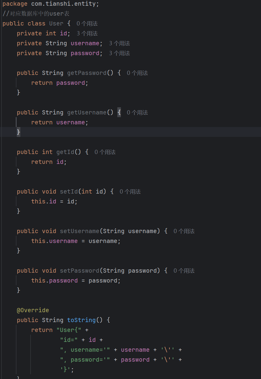 对应user数据表,编写实体类,提供getter/setter方法,重写toString方法(生成即可)