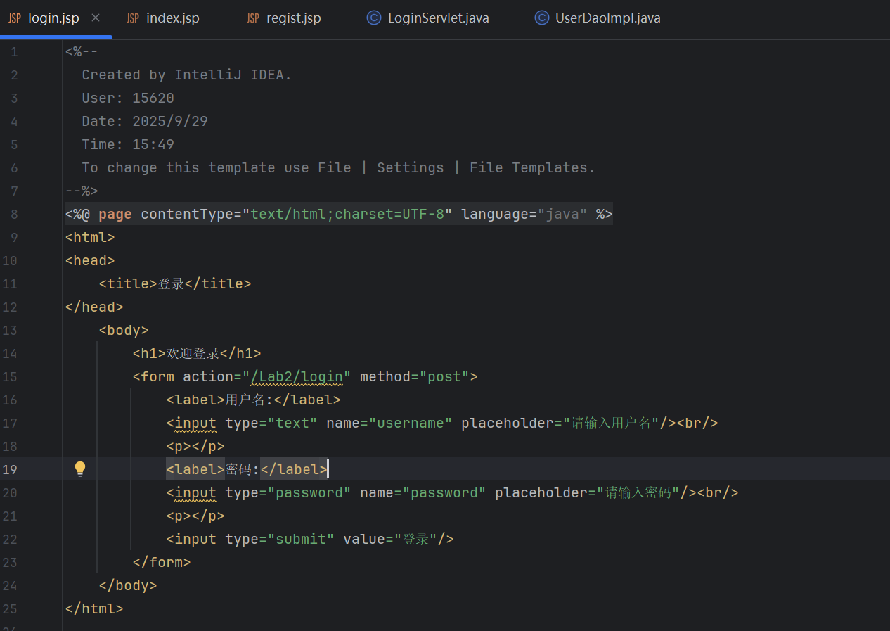 - 在项目web包下创建login.jsp页面,编写表单,包含用户信息(用户名、密码、登录按钮)