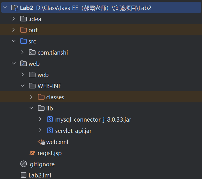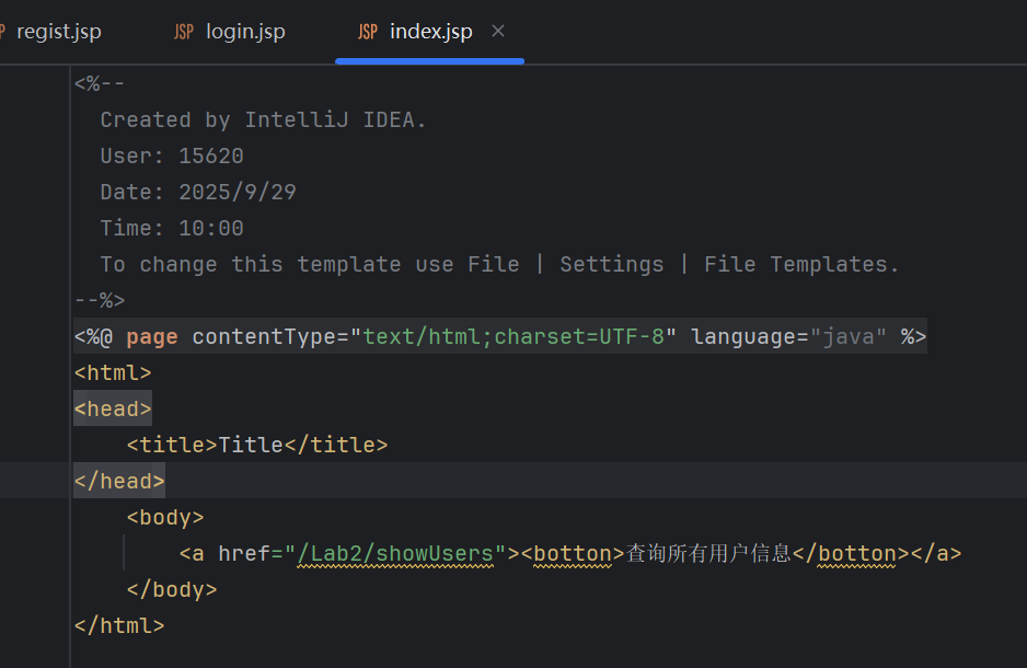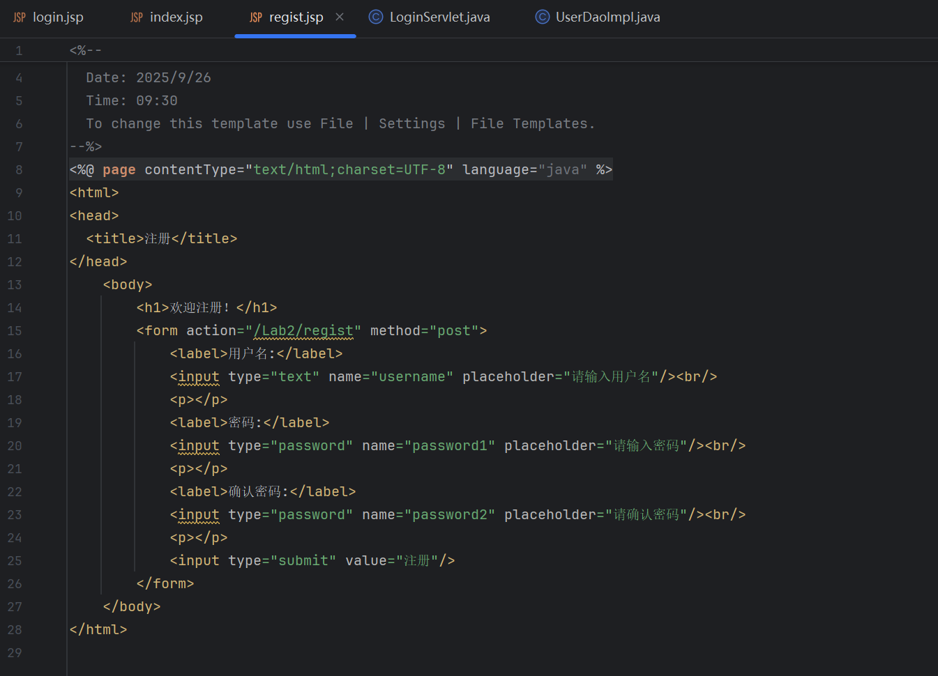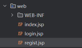 - 在项目web目录下创建regist.jsp注册页面,编写表单,要求包含注册信息(用户名、密码、确认密码、注册按钮)
