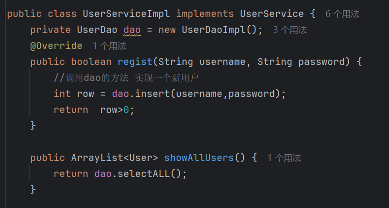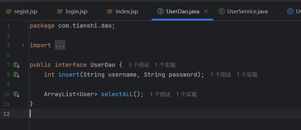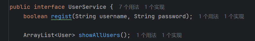一般来说先,根据面现象对象编程的思想,先写接口,不关心具体怎么实现,但是编译器可以自动生成,所以依次建立两个文件在service包下即可,使用接口后点击让编译器自动在UserService中生成方法,本质是多态,和下面的同步创建