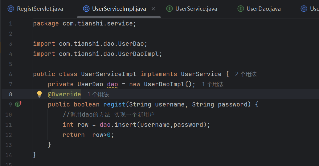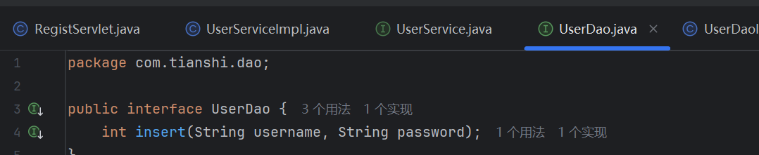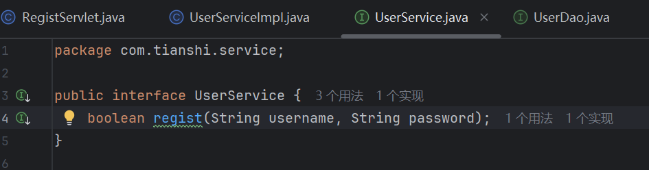 在com.tianshi.web包下创建RegistServlet类,映射请求路径为/regist,实现注册功能