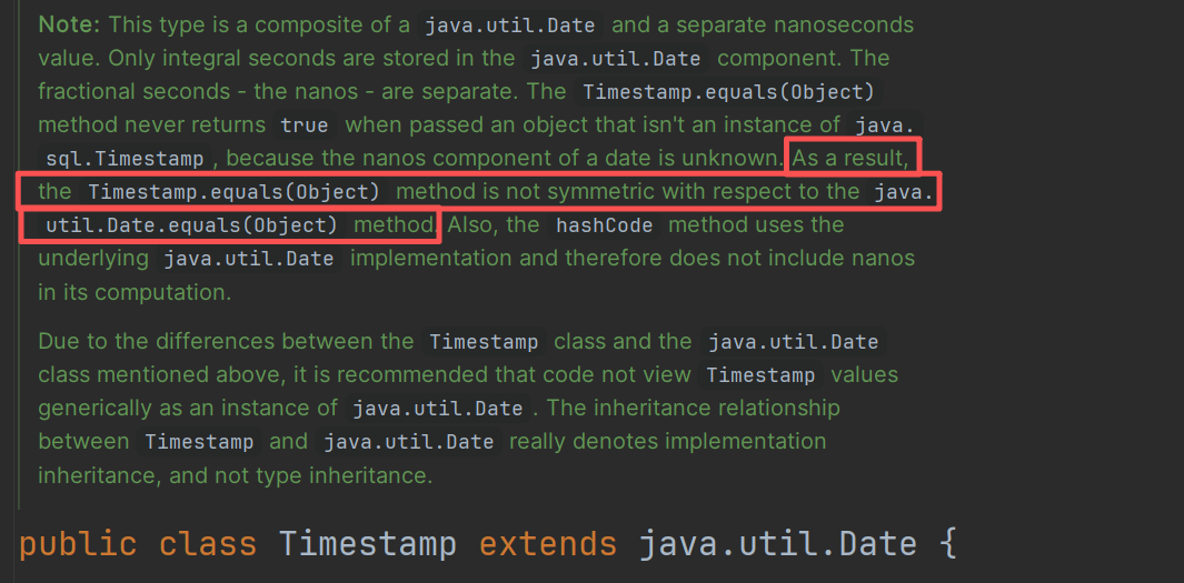 原文P36:在 Java平台类库中,有一些类扩展了可实例化的类,并添加了新的值组件。例如:java.sql.Timestamp对java.util.Date 进行了扩展,并增加了nanoseconds 域。Timestamp的 equals 实现确实违反了对称性,如果 Timestamp 和 Date 对象用于同一个集合中,或者以其他方式被混合在一起,则会引起不正确的行为(参考上面的例子)。Timestamp 类有一个免责声明,告诫程序员不要混合使用Date和Timestamp 对象(如下图红框部分)。只要你不把它们混合在一起,就不会有麻烦,除此之外没有其他的措施可以防止你这么做,而且结果导致的错误将很难调试。Timestamp类的这种行为是个错误,不值得仿效。