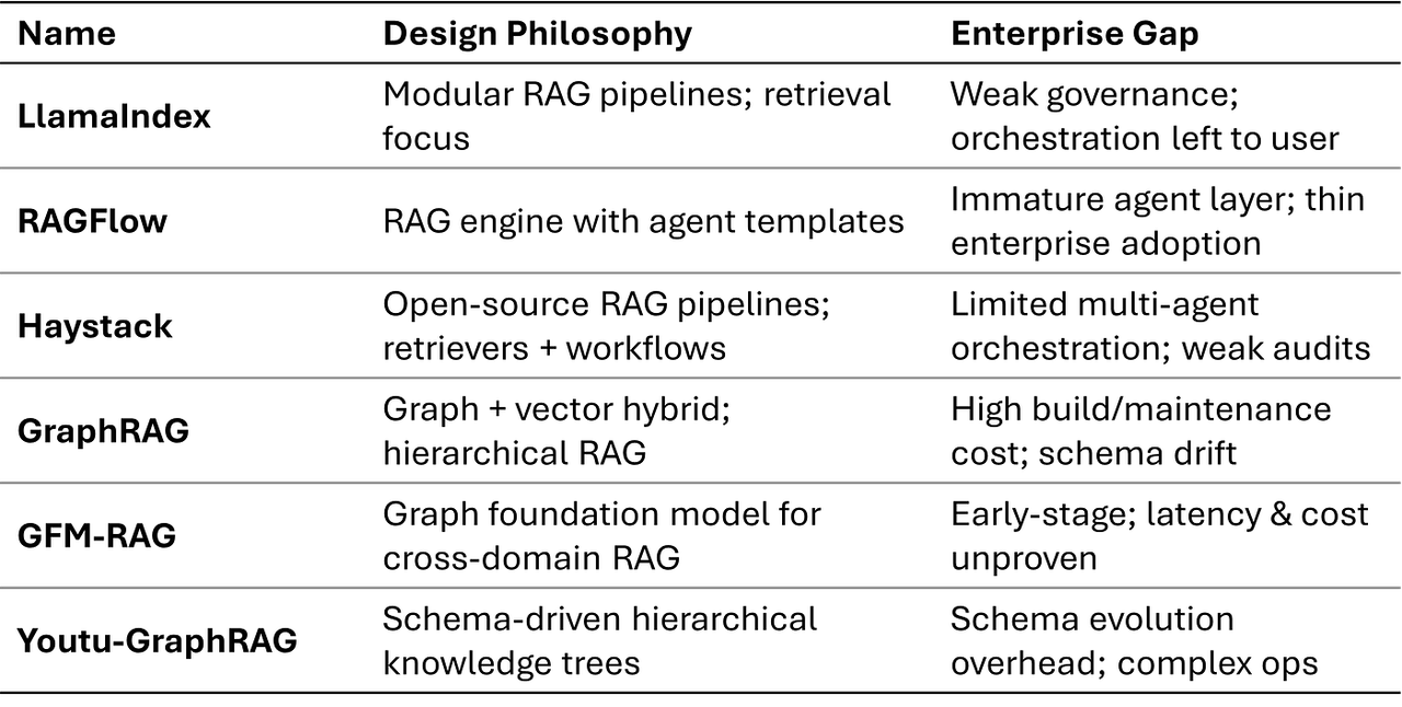该团队专注于检索增强生成(RAG)及其新一波图增强变体。他们擅长知识摄取、索引和上下文检索——这是许多企业智能体的核心。他们的弱点在于:往往仅停留在检索阶段,将编排、治理和容错等工作留给用户。