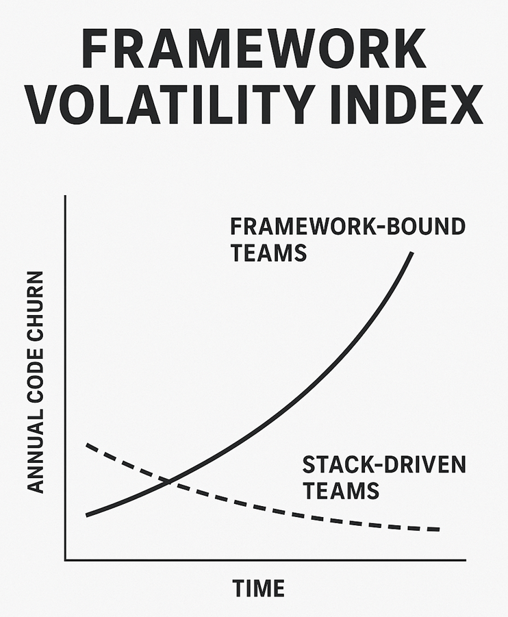 这就是框架波动率指数在起作用——它衡量的是你所在堆栈之下的基础变动的频繁程度。而趋势线只指向一个方向:波动率正在上升。