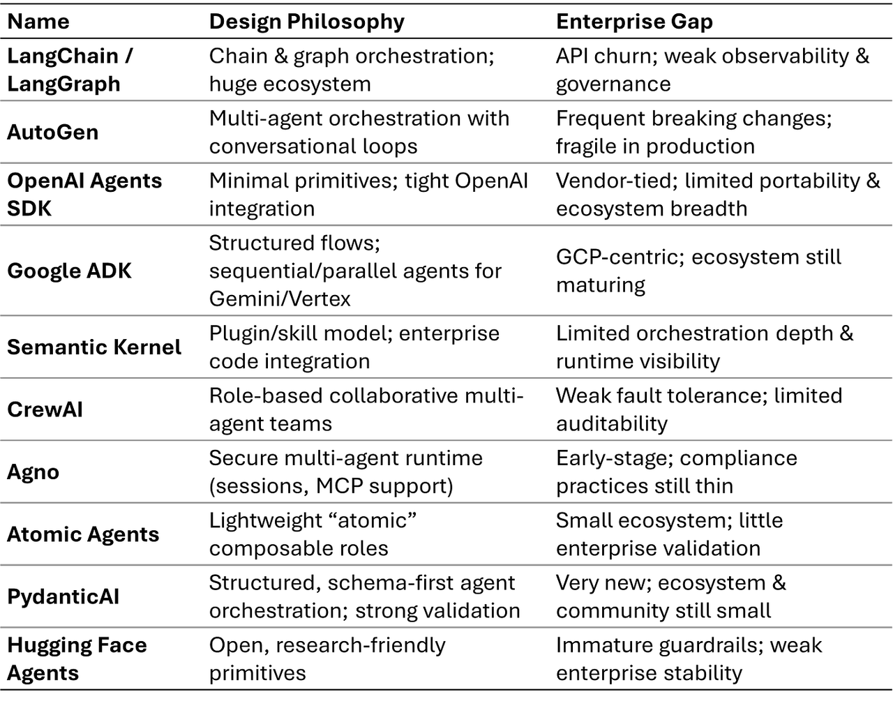 这些是代码优先的库和运行时,专为希望直接在代码中组合代理的开发者设计。它们发展迅速、具有实验性且由社区驱动,非常适合用于原型设计和研究。但它们也存在API 频繁变更、重大变更以及治理功能薄弱等问题。如果没有架构隔离,直接将系统连接到其中一个库或运行时,就会导致返工。