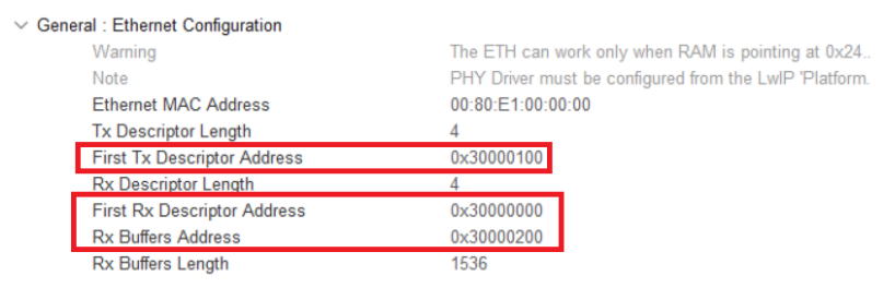(1) 以太网数据是通过 ETH 专用 DMA 进行的,以太网发送/接收缓存不能存储在 DTCM RAM 中,而 STM32CubeMX 创建工程时默认可能把数据存储在 DTCM RAM 中去。