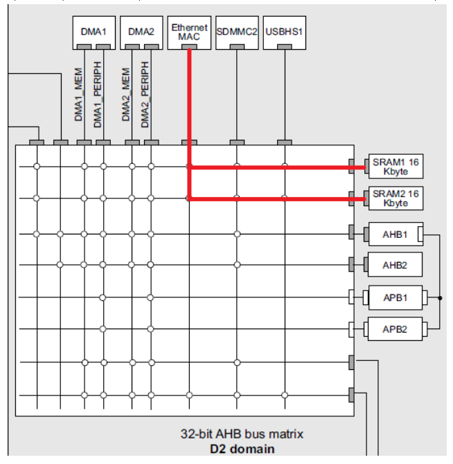 (3) 根据 STM32H7 内部总线框图,可知 ETH_MAC 只能访问位于 D2 域内的 SRAM。因 此,我们需要将 LWIP 所需的缓存分配到 D2 域的 SRAM 上。