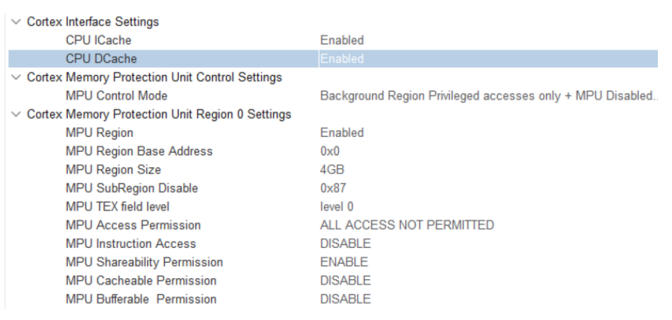 首先我们使用 STM32CubeMX 创建一个基于 STM32H723ZG 的工程,MPU 默认配置如 下:
