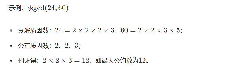 步骤:将两个数分别分解为质因数的乘积,提取所有公有质因数并相乘,结果即为最大公约数。