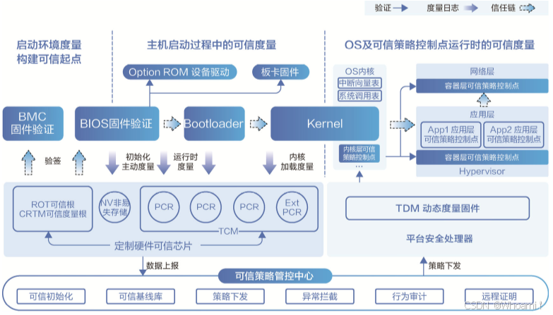 1 | BIOS验证 | 硬件可信芯片 | 芯片优先启动,直接访问存储芯片获取BIOS数据并进行可信验证。 | 验证通过后,才启动CPU。 |