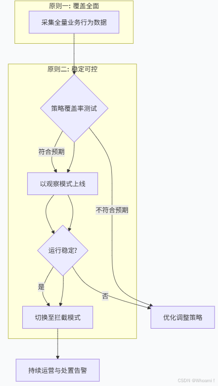 核心手段:观察模式。策略上线初期只记录日志而不拦截,通过分析日志验证策略准确性,运行稳定后方可切换到拦截模式。