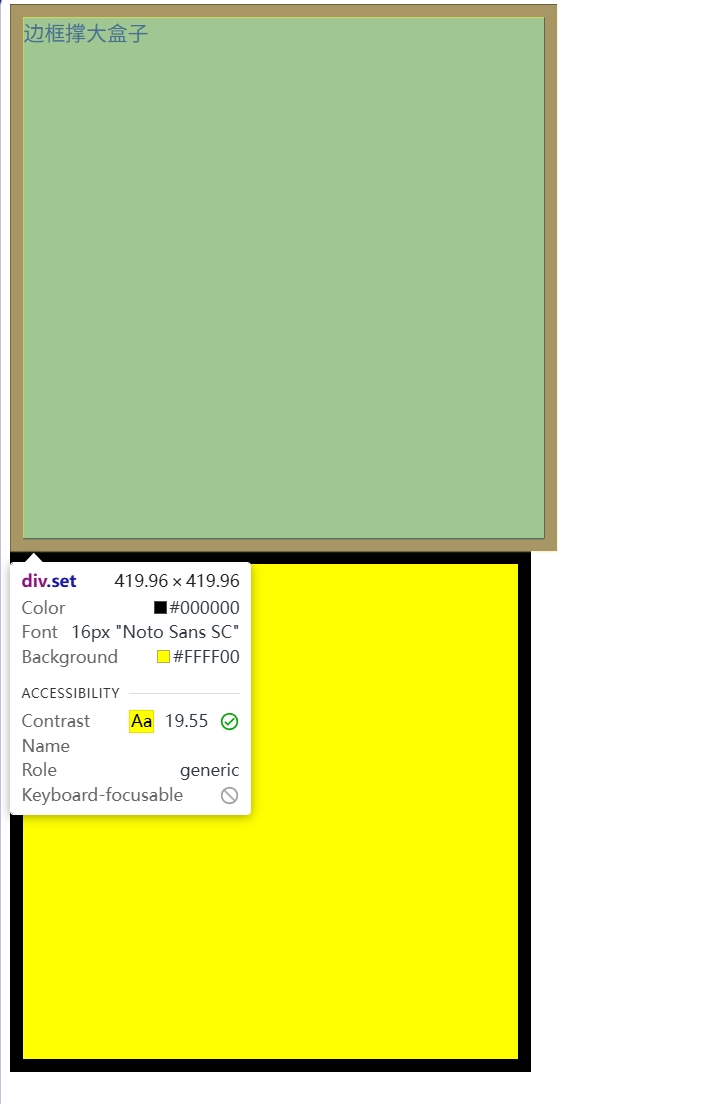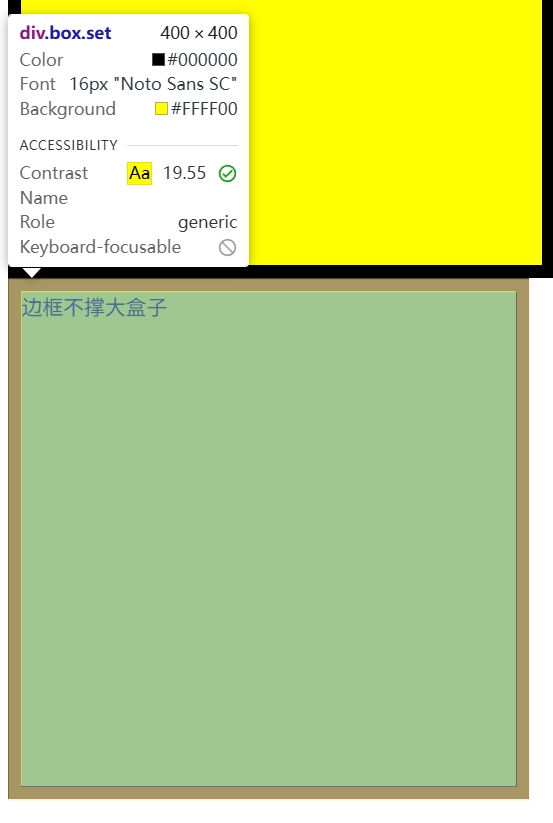 <head><meta charset="UTF-8"><meta name="viewport" content="width=device-width, initial-scale=1.0"><title>Document</title><style>.set {background-color: yellow;border-style: solid;width: 400px;height: 400px;border-width: 10px;}.box {box-sizing: border-box;}</style>